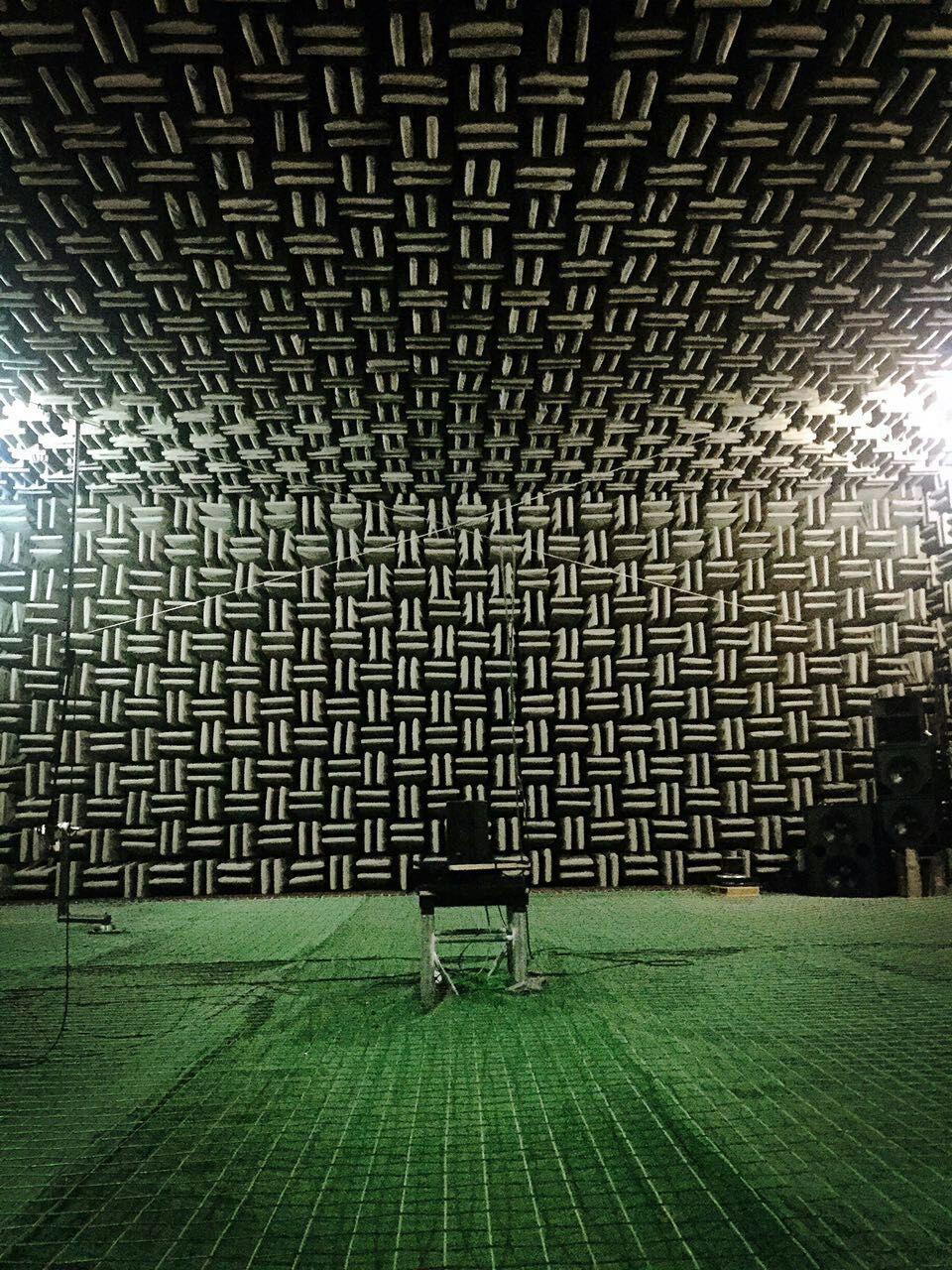 消聲室占地面積360m2,是亞洲最大的消聲室之一。消聲室建筑為雙層隔聲殼體結(jié)構(gòu),外墻殼體由鋼筋混凝土加砌塊構(gòu)成;內(nèi)層殼體由混凝土整體澆鑄而成,整體內(nèi)殼建筑加附屬構(gòu)件總重約1700噸,坐落在底部的528個(gè)雙旋機(jī)車(chē)彈簧上,成為全懸浮狀態(tài)。消聲室內(nèi)六面安裝6268個(gè)雙峰吸聲尖劈,吸聲尖劈長(zhǎng)度為1.2米,內(nèi)部填充高級(jí)超細(xì)玻璃棉氈,外包雙層玻璃纖維窗紗布,在100Hz以上頻率吸聲系數(shù)大于99%。工作下限頻率接近50Hz;測(cè)試環(huán)境本底噪聲可達(dá)3dB(A計(jì)權(quán)),可滿足各類電聲和視聽(tīng)設(shè)備標(biāo)準(zhǔn)測(cè)試需要:如GB/T 12060.5-2011、GB/T9397、GB/T 313、GB/T14198、GB 9401、GB/T 13581、SJ/T 10406、GB 4902、 IEC 60268-5,AES2-1984(r2003),EASE等中國(guó)國(guó)家及國(guó)際標(biāo)準(zhǔn)。