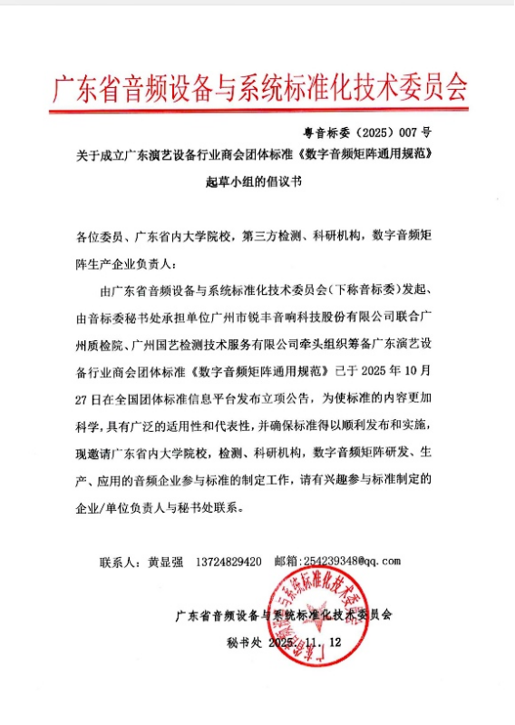 由廣東省音頻設(shè)備與系統(tǒng)標(biāo)準(zhǔn)化技術(shù)委員會(huì)(下稱(chēng)音標(biāo)委)發(fā)起、由中國(guó)賽寶實(shí)驗(yàn)室、賽西(深圳)電子信息產(chǎn)品標(biāo)準(zhǔn)化工程中心有限公司、廣州質(zhì)檢院、廣東省中南聲像燈光設(shè)計(jì)研究院、廣州市銳豐音響科技股份有限公司、深圳市東微智能科技有限公司、廣東保倫電子股份有限公司、廣州國(guó)藝檢測(cè)技術(shù)服務(wù)有限公司牽頭組織籌備廣東演藝設(shè)備行業(yè)商會(huì)團(tuán)體標(biāo)準(zhǔn)《數(shù)字音頻矩陣通用規(guī)范》、《數(shù)字電源時(shí)序器通用規(guī)范》已于2025年10月27日在全國(guó)團(tuán)體標(biāo)準(zhǔn)信息平臺(tái)發(fā)布立項(xiàng)公告,為使標(biāo)準(zhǔn)的內(nèi)容更加科學(xué),具有廣泛的適用性和代表性,并確保標(biāo)準(zhǔn)得以順利發(fā)布和實(shí)施,現(xiàn)邀請(qǐng)廣東省內(nèi)大學(xué)院校,檢測(cè)、科研機(jī)構(gòu),數(shù)字音頻矩陣/數(shù)字電源時(shí)序器產(chǎn)品研發(fā)、生產(chǎn)、應(yīng)用的音頻企業(yè)參與標(biāo)準(zhǔn)的制定工作,請(qǐng)有興趣參與標(biāo)準(zhǔn)制定的企業(yè)/單位負(fù)責(zé)人與秘書(shū)處聯(lián)系。